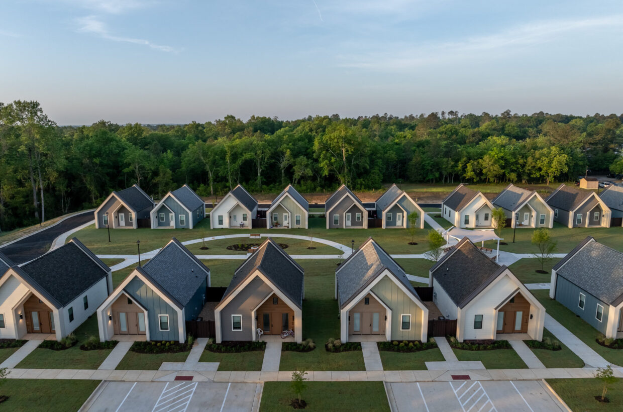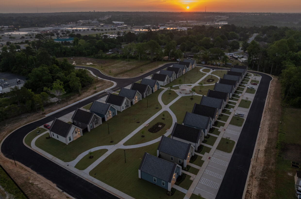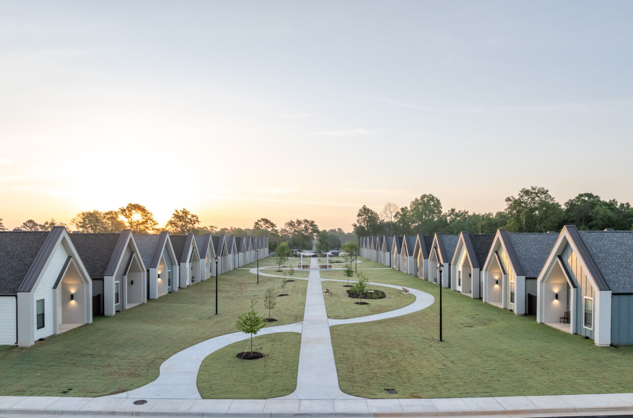 Serenity Courtyard of Macon features 26 single-family tiny homes designed with a universal design approach, ensuring that each space is usable, accessible, and inclusive for individuals of all ages and abilities. This community is specifically intended to support seniors aged 55 and older who are living with mental health or substance use disorders and have experienced homelessness.